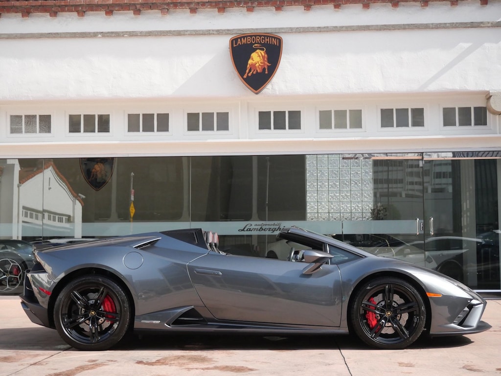 Lamborghini Beverly Hills is pleased to present for sale this stunning 2021 Lamborghini Huracan EVO Spider RWD as part of our hand-selected pre-owned lineup. This gorgeous example is finished in Grigio Lynx Metallic exterior paint and Nero Ade/Rosso Alala interior.