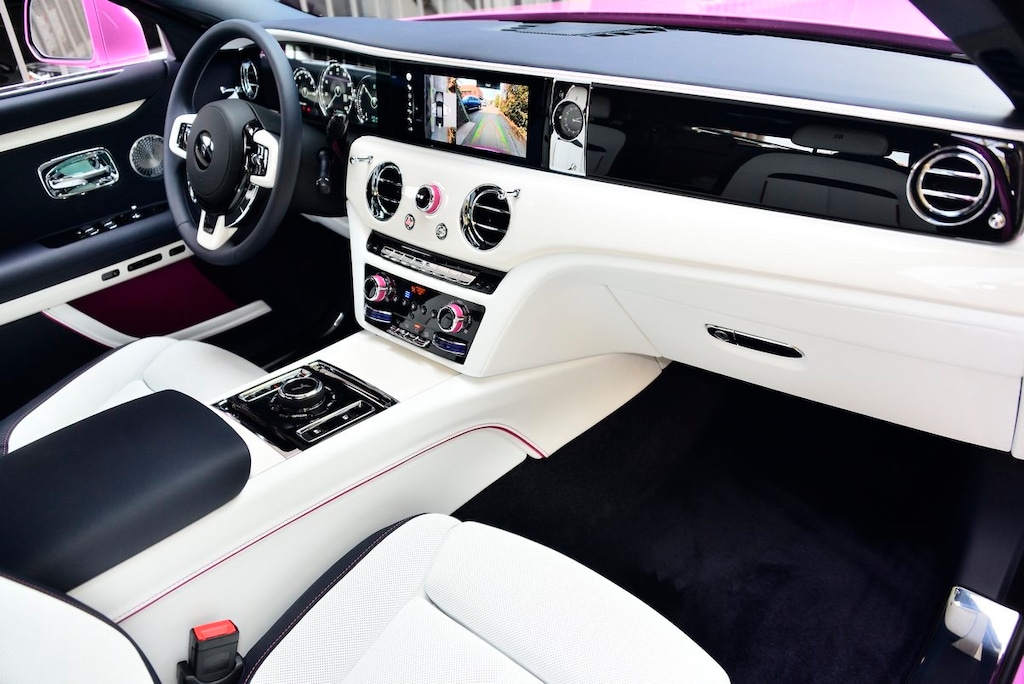 Rolls-Royce Motor Cars Beverly Hills is pleased to present for sale this stunning 2021 Rolls-Royce Ghost as part of our hand-selected pre-owned lineup. This gorgeous example is finished in Bespoke Friskee Pink exterior paint and Navy Blue/Arctic White interior.