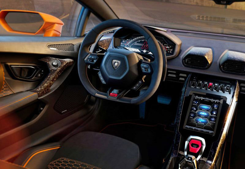 The Huracán EVO was developed to amplify your daily routine by anticipating the needs of the driver, making your day-to-day experience behind the wheel unique and totally personal. A state-of-the-art control system and innovative touchscreen easily manage the car’s functions and entertainment system. This, combined with dazzling aerodynamic design, elevate the performance and driving emotions to unprecedented levels.The cockpit features a cutting-edge 8.4” touchscreen system built into the central tunnel, which makes it possible to control the car and entertainment functions with a tap of your fingertips. The exclusive interior finishes, stemming from authentic Italian design, are made with the finest-quality materials: the upholstery is available in leather, Alcantara and—for the first time—Carbon Skin®, an innovative carbon fiber material exclusively available with Lamborghini. All these details make the on-board experience even more unique and refined.